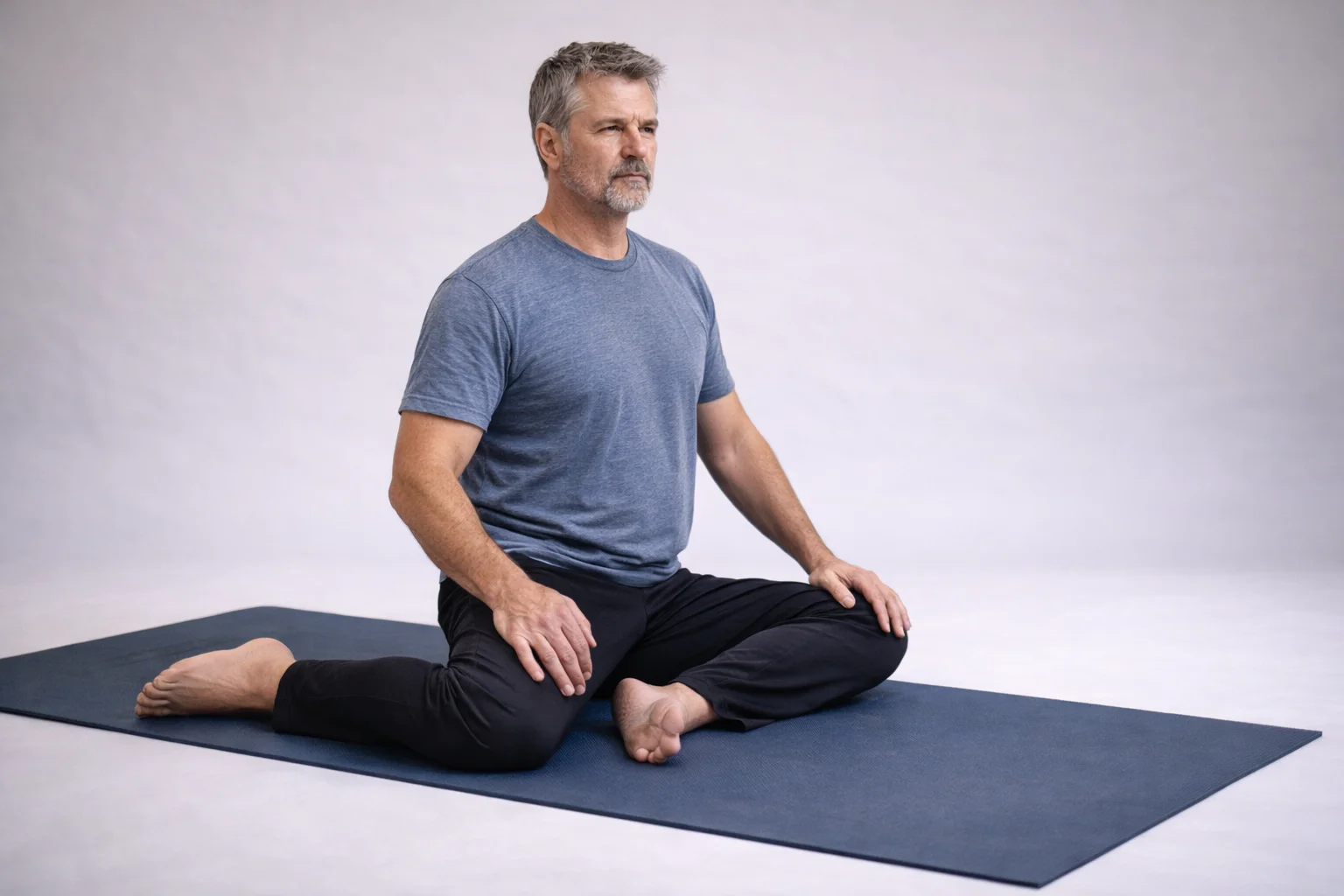 Week 1: Couldn't achieve position without significant props. Sat on stacked yoga blocks (6 inches), still couldn't get knees to 90°. Felt like his hips were "made of concrete." Humbling for a man who'd worked physically his whole life.