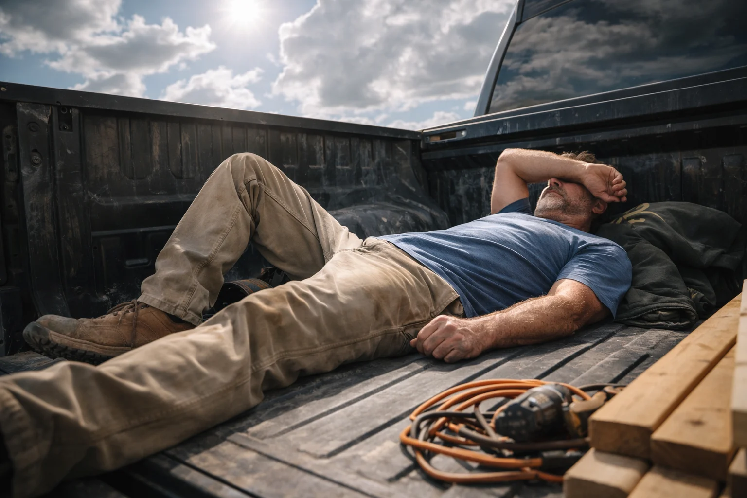The lunch breaks got longer. Bram would lie flat in his truck bed, a rolled-up jacket under his knees, staring at the sky through breaks in the clouds, trying to decompress his spine enough to make it through the afternoon. The cold metal against his back was simultaneously soothing and depressing.