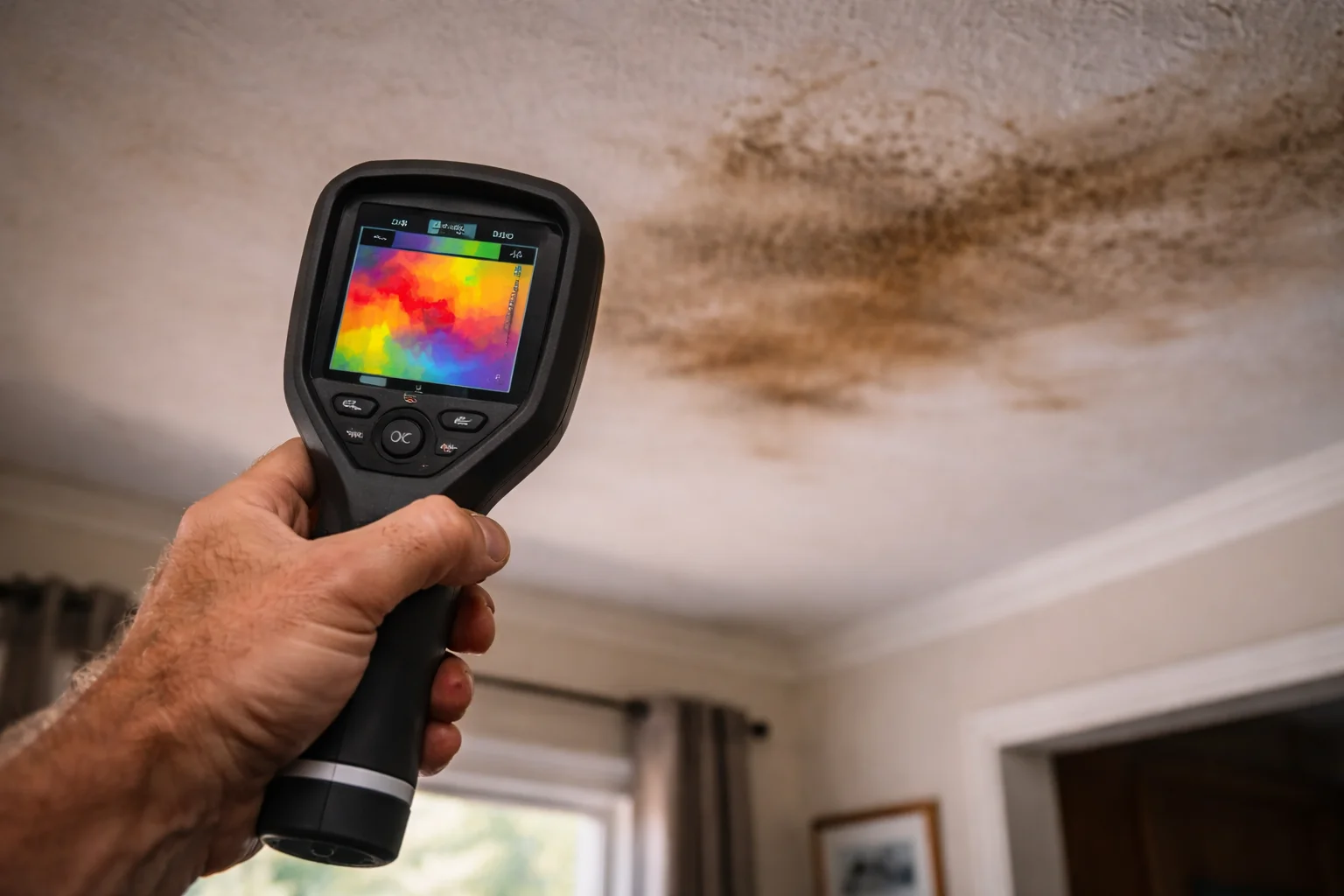 He pulled out the thermal camera, which showed the ceiling in colored heat signatures. A large blue patch—indicating cold, wet material—spread across an area three times larger than the visible stain.